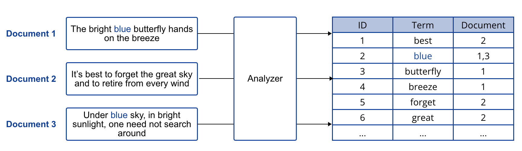 Document의 문장들이 Analyzer를 통과하면서 토큰화 되어 필요한 단어들만 가지고 일종의 단어장 생성이 생성됩니다.