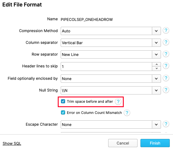File Format을 수정하여, 값 주변의 공백을 제거하는 옵션을 선택하면 됩니다.