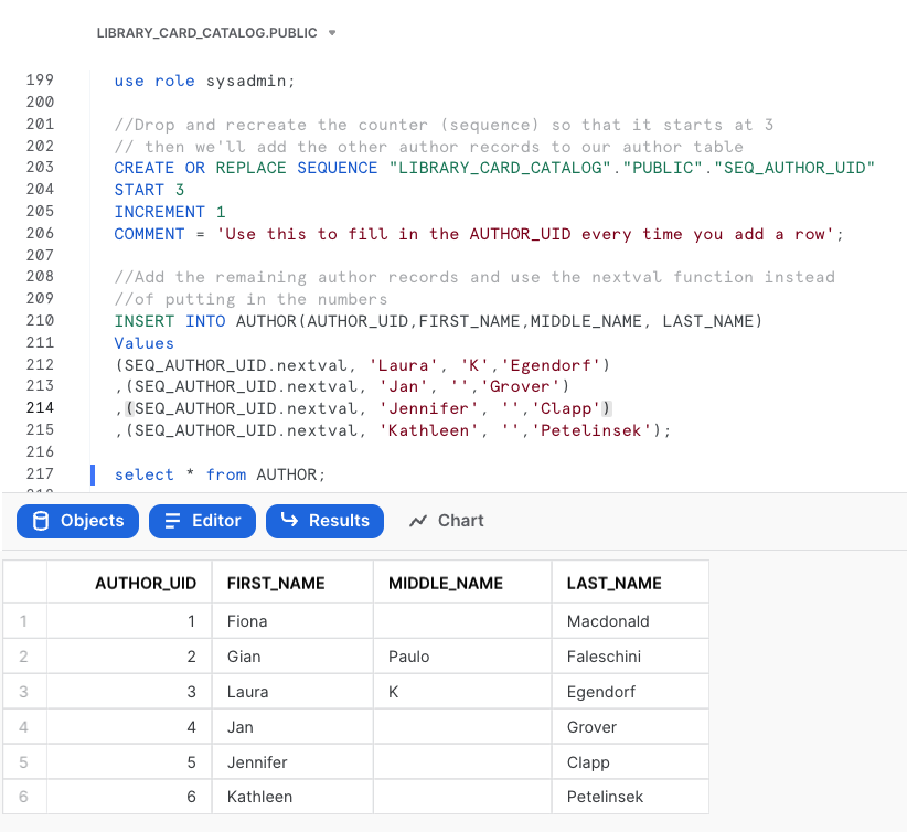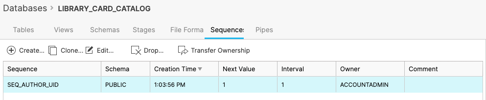 CREATE OR REPLACE SEQUENCE "LIBRARY_CARD_CATALOG"."PUBLIC"."SEQ_AUTHOR_UID"