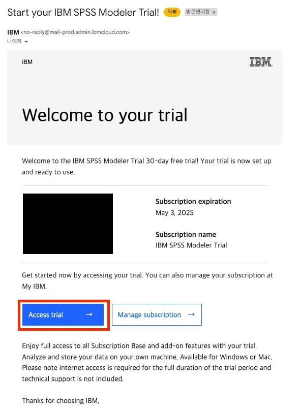 가입 완료 후 평가판 사용 등록을 마치면 아래와 같은 메일이 오고, Access trial 버튼을 누르면 IBM 페이지로 이동합니다.