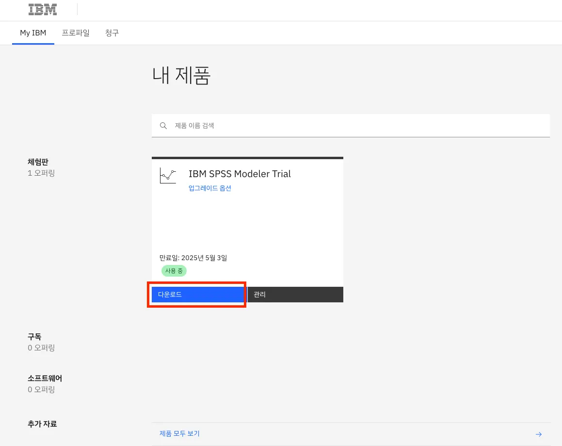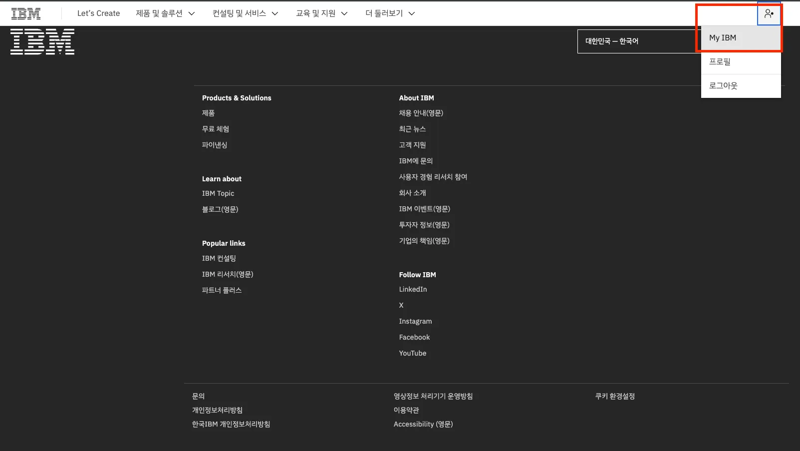 오른쪽 상단의 ‘My IBM’ 버튼을 클릭하시면 다운로드 페이지로 이동할 수 있습니다!