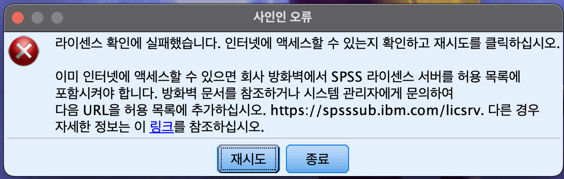 설치가 끝나고 SPSS Modeler 앱을 실행하면 아래와 같이 라이선스 에러가 발생하여 실행이 안될 수 있습니다.