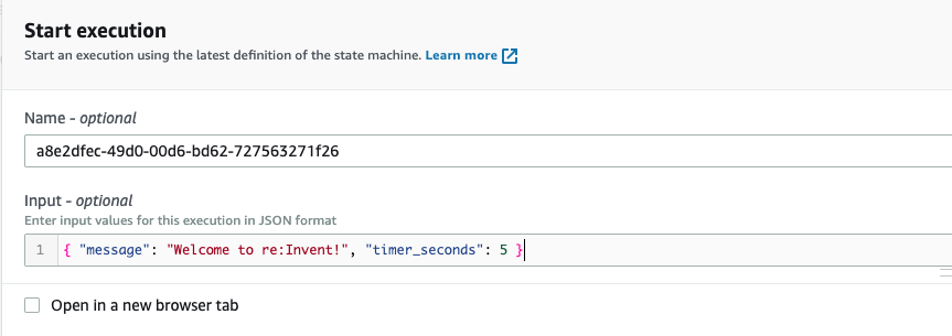Input에 { "message": "Welcome to re:Invent!", "timer_seconds": 5 } 를 입력한 후 실행합니다.