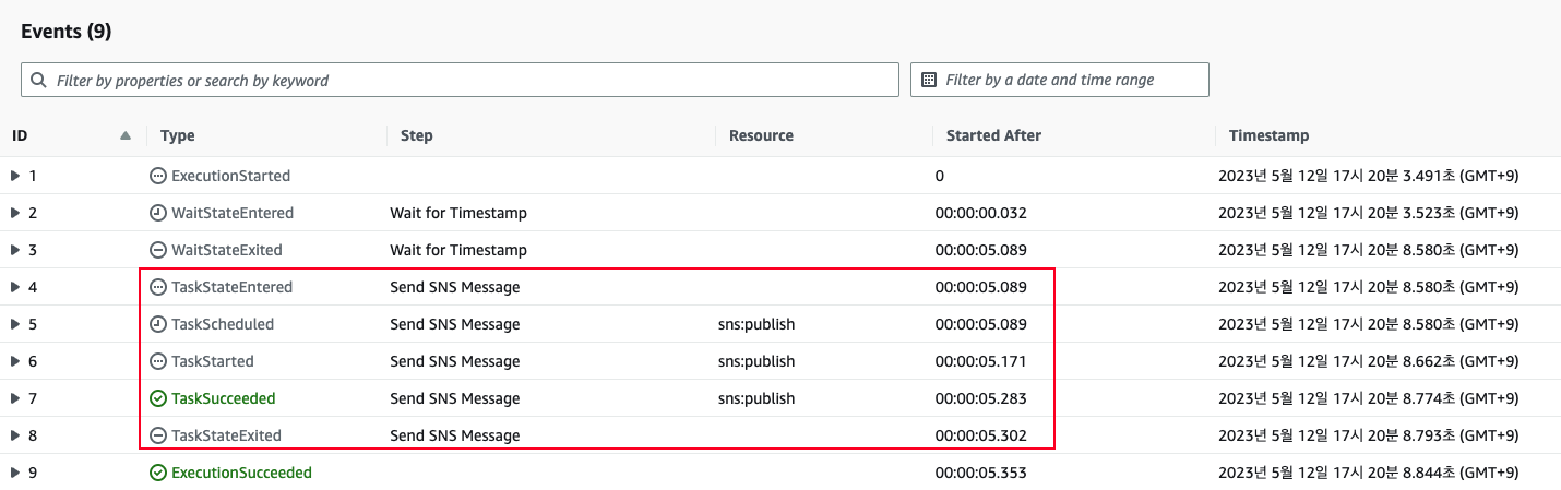 이벤트 히스토리를 살펴보면, SNS에 메세지 보내는 작업 실행시간을 확인할 수 있습니다.