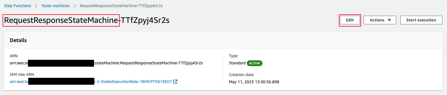 2. AWS Step Function console ▶️ RequestResponseStateMachine 클릭 ▶️ Edit 클릭