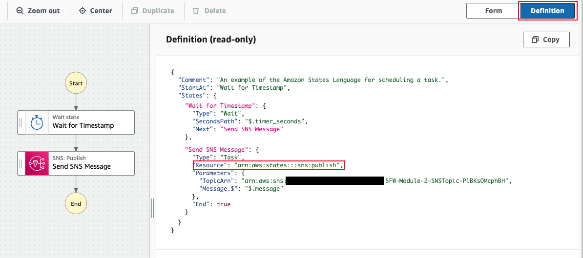 - 서비스를 호출하고 Step Functions에서 작업이 완료될 때까지 대기하도록 합니다.